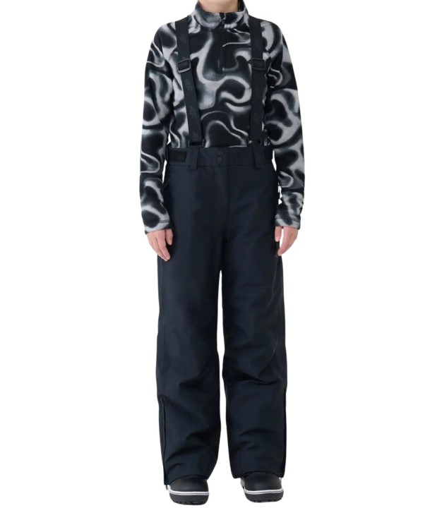 These insulated girls' ski trousers offer complete protection and comfort for all-day skiing, featuring the NEO DRY WP 8,000 / MVP 5,000 membrane for reliable waterproofness against moderate snow and excellent breathability. The trousers are fully protected against moisture with a water-repellent impregnation on the outer layer and fully taped seams. Designed for functionality, they include detachable suspenders, an adjustable velcro belt for a perfect fit, and built-in snow gaiters to block snow. Durability is enhanced by reinforcements in the lower part of the legs, while profiled knees and zipped bottom leg openings with a snap pin-up option ensure easy movement and boot fitting. Two side zipped pockets provide secure storage, and reflective elements increase visibility.