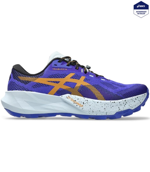 The TRABUCO 14 shoe is designed to help you run through unpredictable trail terrain more confidently. ASICSGRIP technology is positioned in the outsole for advanced traction on off-road surfaces. Approximately 4 grams lighter than the previous version, this shoe features an extra 2mm of FF BLAST MAX cushioning underfoot. This helps create cloud-like softness at impact and a responsive energy return at toe-off. The shoe has a new trail fit that offers a more supportive midfoot lockdown. This helps reduce movement within the shoe while providing a wider forefoot that allows for more comfort on long trail runs.