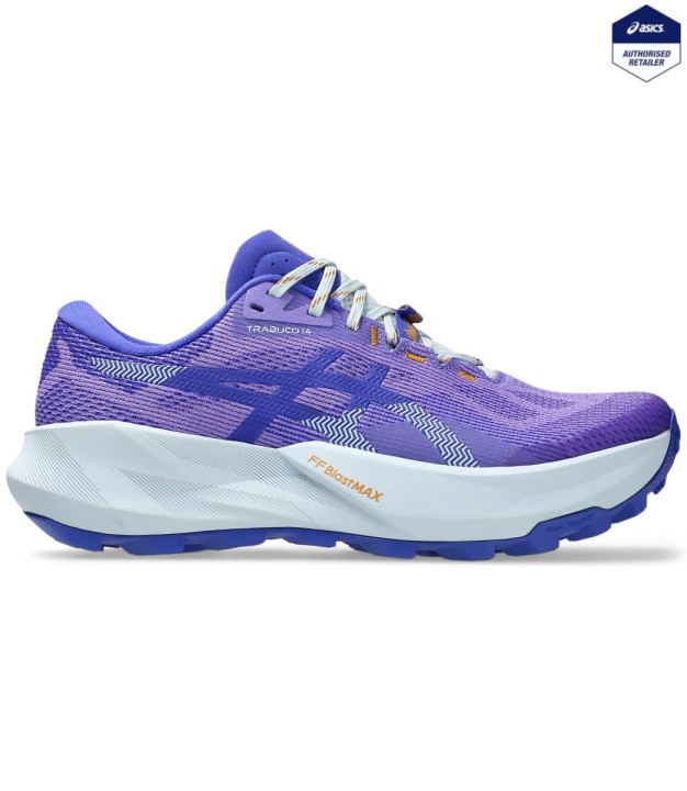 The TRABUCO 14 shoe is designed to help you run through unpredictable trail terrain more confidently. ASICSGRIP technology is positioned in the outsole for advanced traction on off-road surfaces. Approximately 4 grams lighter than the previous version, this shoe features an extra 2mm of FF BLAST MAX cushioning underfoot. This helps create cloud-like softness at impact and a responsive energy return at toe-off. The shoe has a new trail fit that offers a more supportive midfoot lockdown. This helps reduce movement within the shoe while providing a wider forefoot that allows for more comfort on long trail runs.