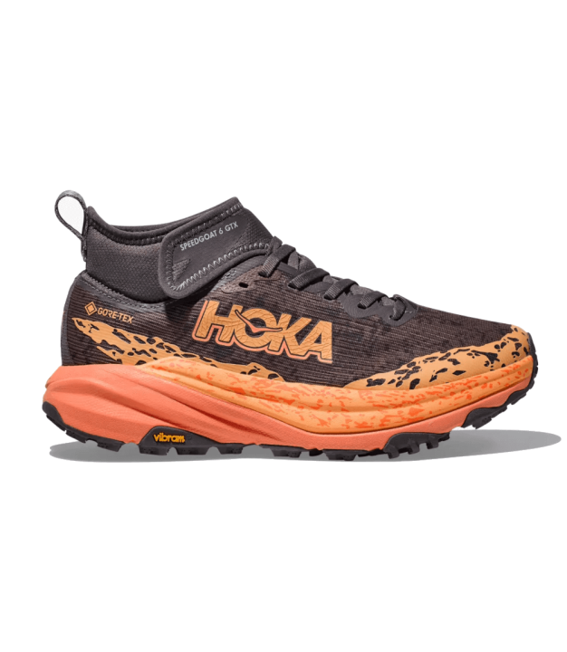 The Speedgoat 6 Mid GORE-TEX is built with the same trust-inspiring waterproof GORE-TEX membrane as before—but now with a more flexible, running-friendly collar. Grounded in Vibram® Megagrip with Traction Lug for enhanced bite on loose soil, this trail icon employs a foot-cradling heel bolster, lightweight, responsive midsole compound, and a protective toe rand for charging through the rough stuff. Bring it, weather.